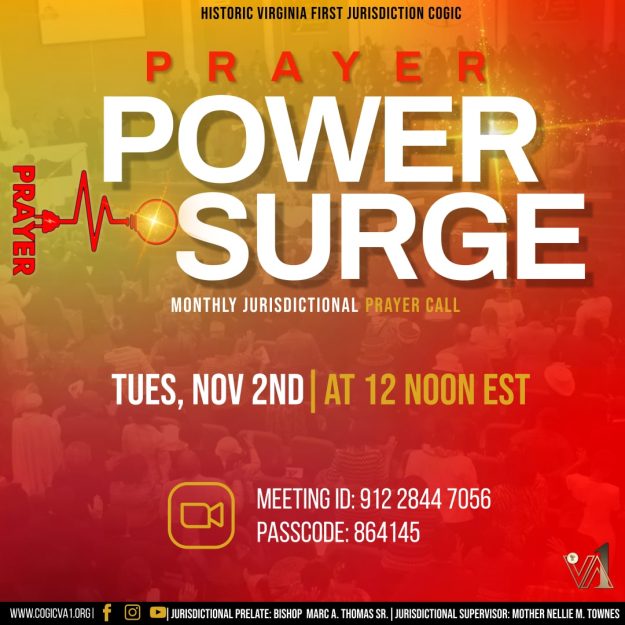 Join the Saints of the Historic First Ecclesiastical Jurisdiction of Virginia for our 1st Tuesday Power Surge Prayer at 12noon EST via Zoom, Facebook, or YouTube. “Men ought always pray…