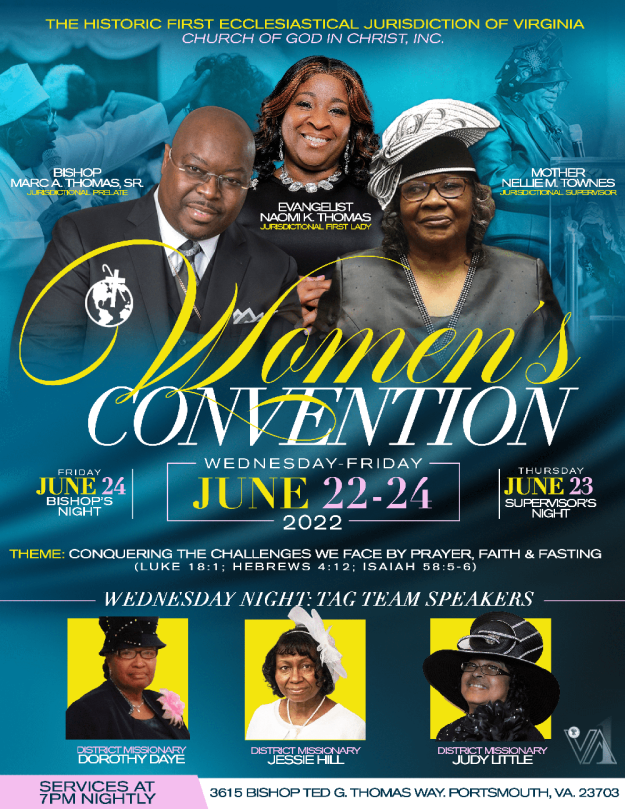June 20, 2022 (Portsmouth, Virginia) – You are cordially invited to join our Supervisor, Mother Nellie M. Townes, and the Historic First Ecclesiastical Jurisdiction of Virginia on June 22-24, 2022…