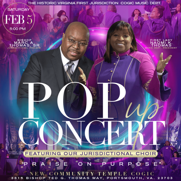 Join the Jurisdictional Music Department for the “Praise On Purpose” Pop Up Concert at New Community Temple COGIC on Saturday, January 5, 2022 at 5pm.