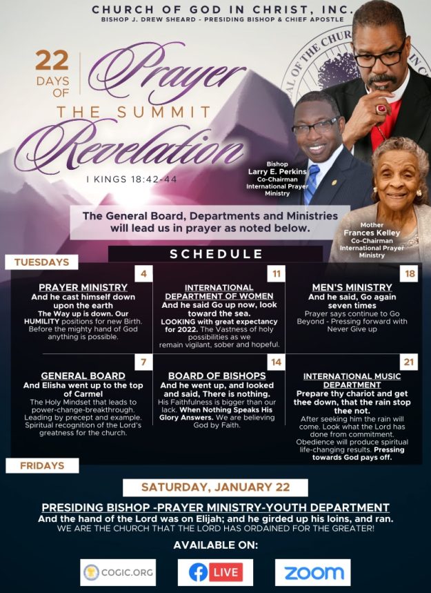 22 DAYS OF PRAYER “THE SUMMIT REVELATION” Tuesdays & Fridays January 1-22, 2022 9AM PST | 10AM MST | 11AM CST | 12PM EST I Kings 18:42-44 42 So Ahab went…