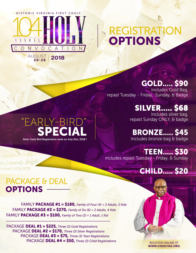 Live Stream Shut-In Daily Sessions Evening Speakers Official Day Registration Accommodations Join us August 19-26, 2018 as the Historic First Ecclesiastical Jurisdiction of Virginia celebrates its 104th Holy Convocation at…