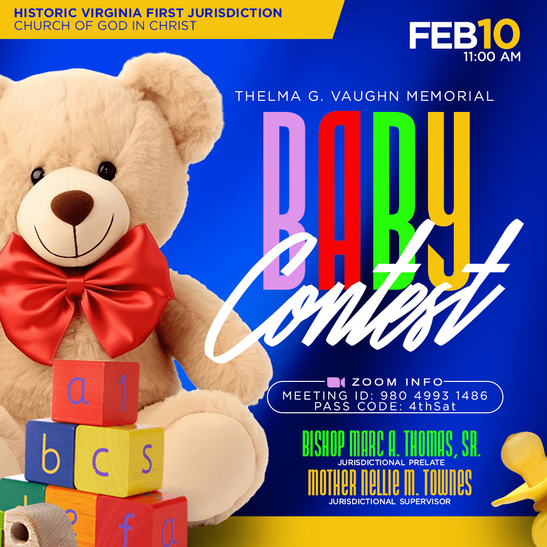 DetailsJoin our Jurisdictional Supervisor of Women, Mother Nellie M. Townes, and the Historic Virginia First Jurisdictional Women’s Department for the 2024 Thelma G. Vaughn Memorial Baby Contest virtually on Saturday,…