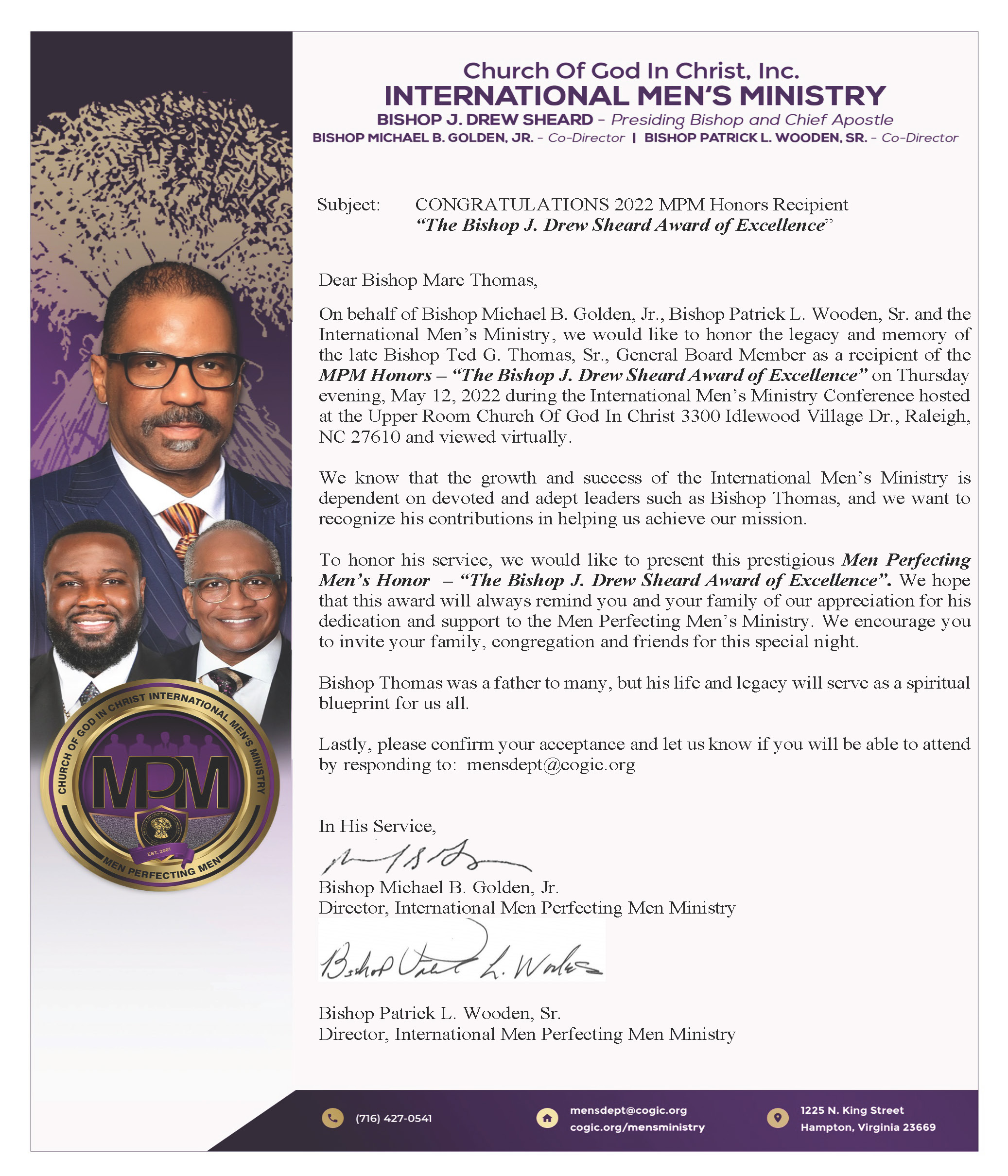 DetailsThe International Men’s Ministry has chosen to honor the legacy and memory of the late Bishop Ted G. Thomas, Sr., General Board Member, for his contribution in assisting MPM to…