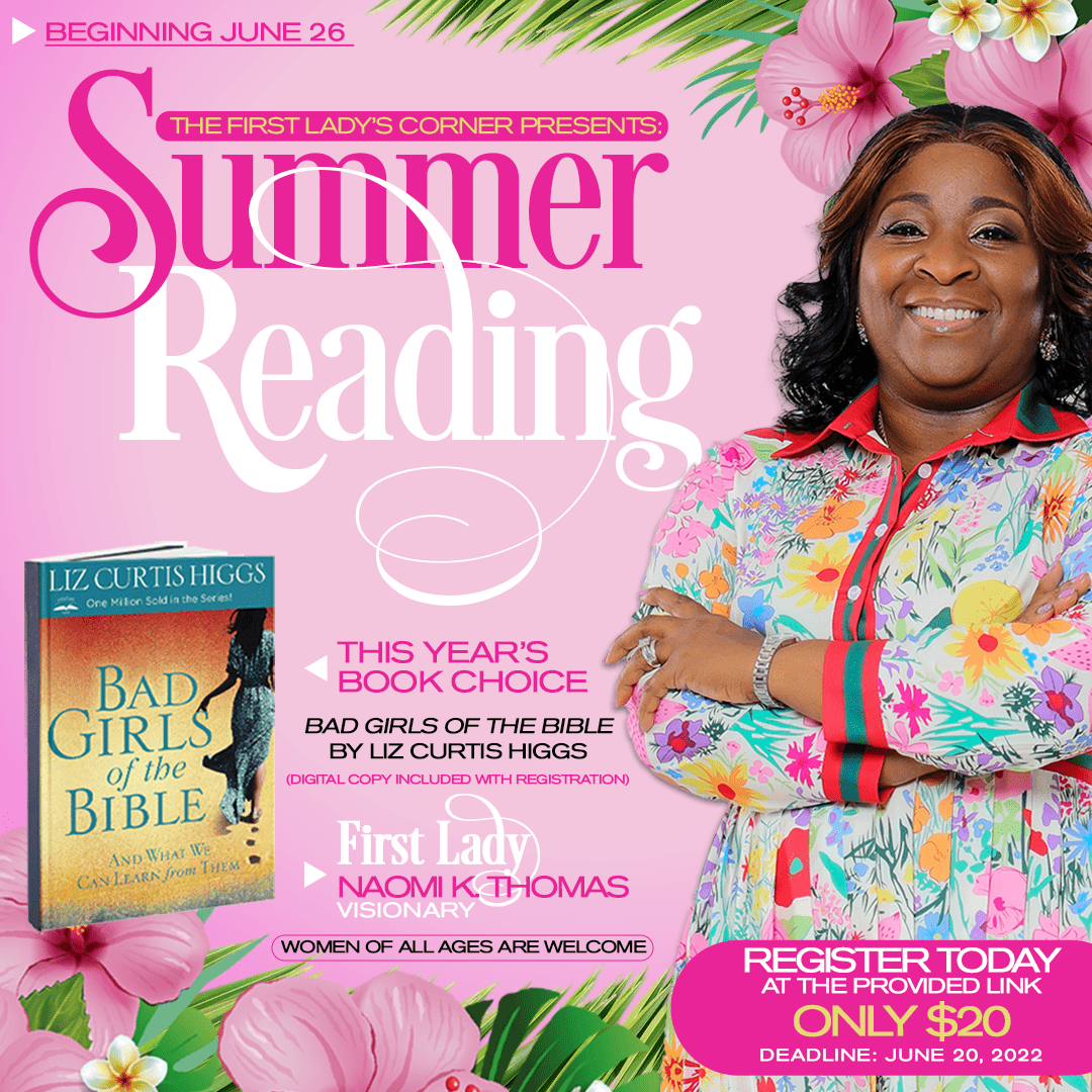 DetailsThe First Lady’s Corner Presents: Summer Reading Program 2022. This year’s book choice is – Bad Girls of the Bible by Liz Curtis Higgs. Click HERE or click the flier…