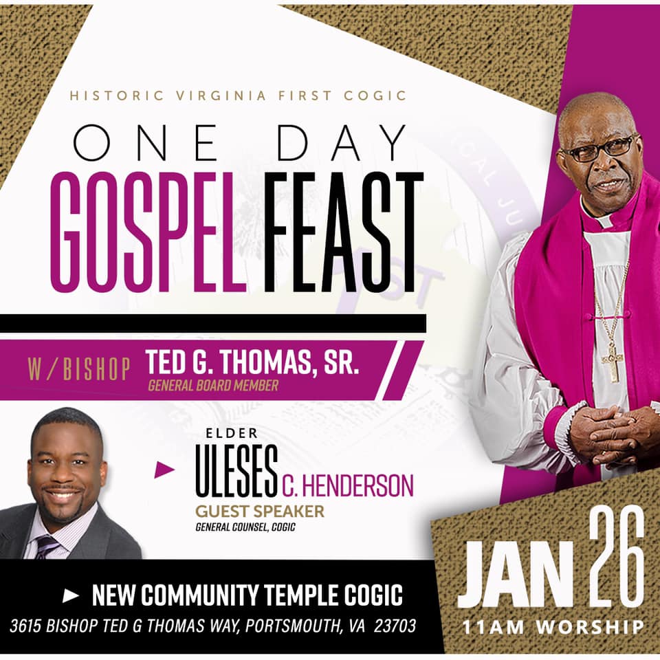 DetailsJoin us on January 26, 2019 at 11:00 am for our Annual One Day Gospel Feast hosted at New Community Temple COGIC, Portsmouth, VA. Our guest speaker with be Elder…